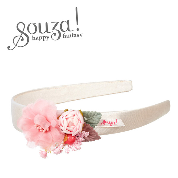 Szeroka (2,5 cm) opaska z kwiatami Dympfy holenderskiej marki Souza! jest wykończona jasną perłową taśmą na zewnątrz oraz miękkim pluszem wewnątrz. Zdobią ją różowe kwiaty i liście. Jest lekka i przyjemna w noszeniu (nie uciska).