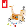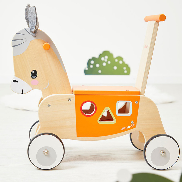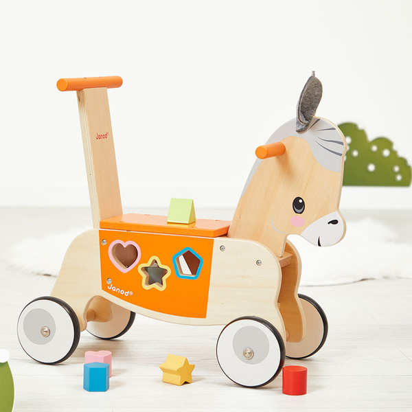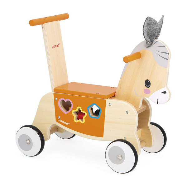 Jeździk i pchacz 2w1 Osiołek z kolekcji Farma francuskiej marki JANOD nie tylko wspiera dziecko w stawianiu pierwszych kroków, ale też w ogólnym rozwoju motorycznym. Na obu ściankach znajduję się otwory w różnych kształtach, przez które można wrzucać do wewnątrz odpowiednie klocki (funkcja sortera). Pojazd ma siedzisko, wygodną rączkę do prowadzenia, długie filcowe uszy oraz kółka wykończone gumą, co sprawia, że nie rysują one podłogi w domu. Zabawka zaprojektowana we Francji zapakowana jest w estetyczne, kartonowe pudełko. Idealnie nadaje się na prezent.