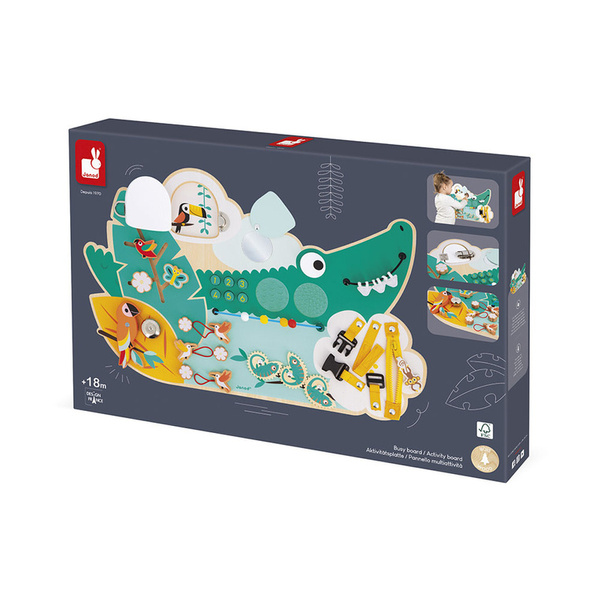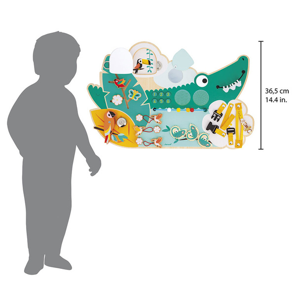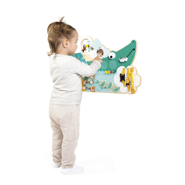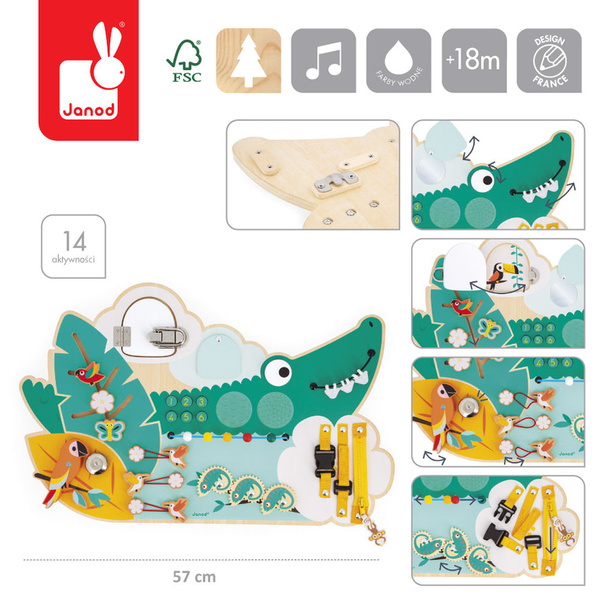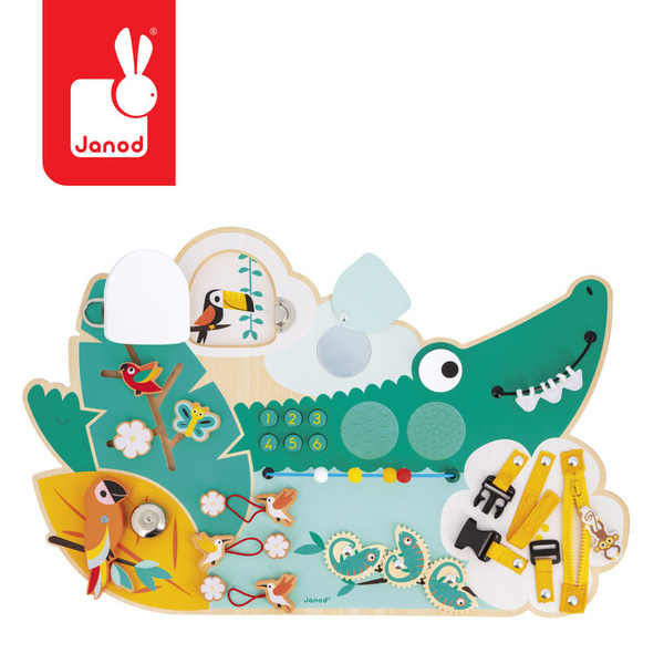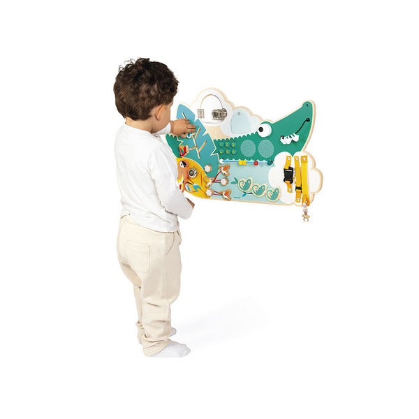 Duża drewniana tablica manipulacyjna Krokodyl z serii Tropik francuskiej marki JANOD to idealna zabawka dla dzieci od 18. miesiąca życia. Wymaga solidnego zamontowania do ściany. Zachwyca estetyką wykonania i pięknymi detalami. Oferuje w sumie 14 aktywności, w tym m.in. różnego rodzaju zapięcia i elementy do przesuwania czy stymulacji sensorycznej (zróżnicowane fakturowo), kółka zębate, przyciski czy dzwonek.