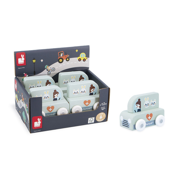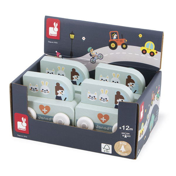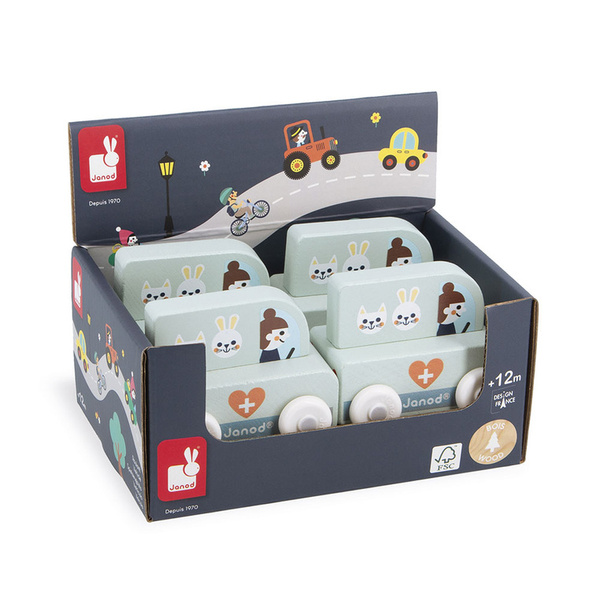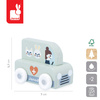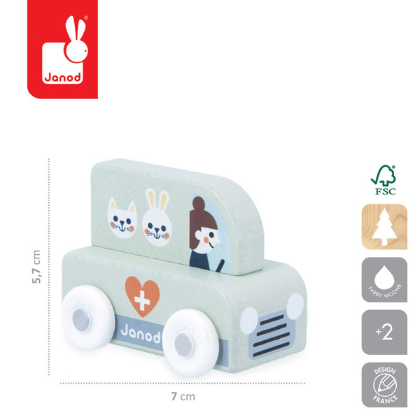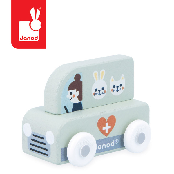 Samochód weterynarza z serii Cross Roads francuskiej marki JANOD to doskonałe uzupełnienie maty-dywanu do zabawy z drogą Góry z tej samej kolekcji. Pojazd wykonany jest z drewna, posiada poręczne kształty dopasowane do małych rączek, jasnoniebieski kolor, a dzięki kółkom łatwo porusza się po różnych powierzchniach. W środku znajduje się uśmiechnięta pani weterynarz, kotek i króliczek, co zachęca malucha do snucia własnych historii i kreatywnej zabawy.