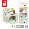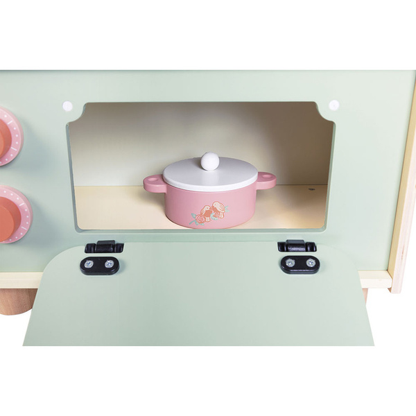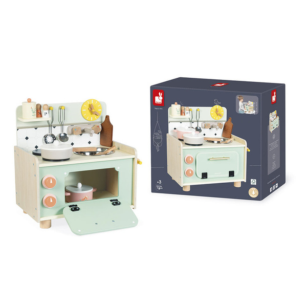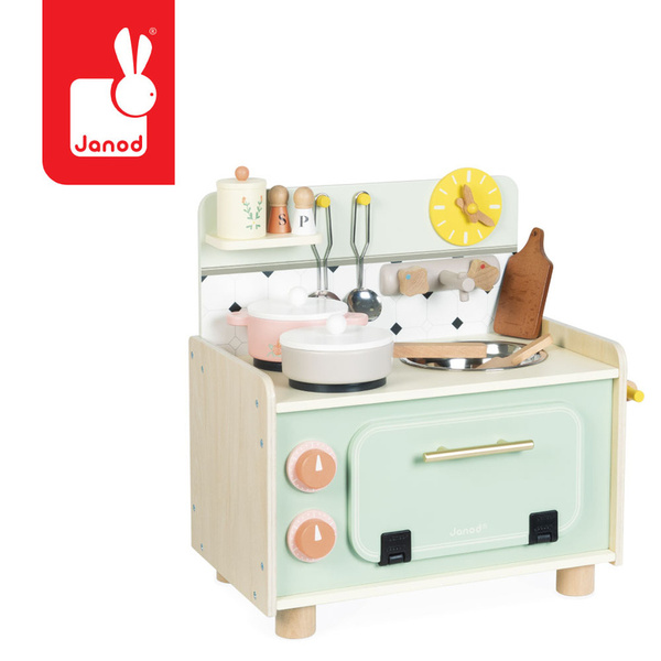 Mała drewniana kuchnia z kolekcji Shiny Grandma francuskiej marki JANOD sprawi mnóstwo radości każdemu dziecku. Pozwoli bezpiecznie uczestniczyć w codziennych czynnościach i rozwijać pasję gotowania. Urocza miętowa kuchnia na niewysokich nóżkach posiada: okrągły, metalowy zlew, dwa palniki, piekarnik z magnetycznym zamknięciem, niedużą górną półeczkę z zegarem i boczny reling na ściereczkę.