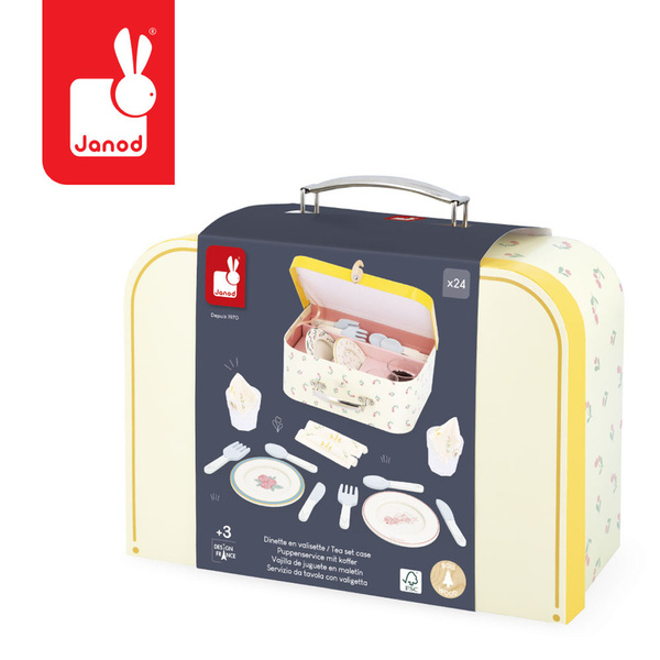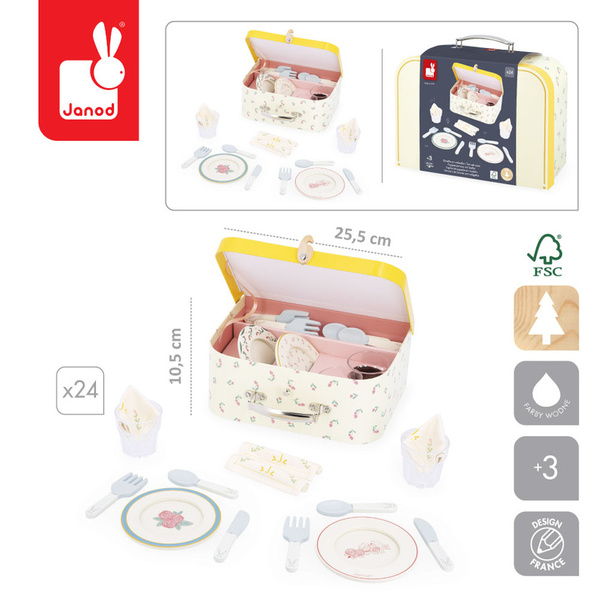 Zestaw piknikowy z kolekcji Shiny Grandma francuskiej marki JANOD sprawi mnóstwo radości każdemu dziecku. Pozwoli dziecku na zorganizowanie własnego pikniku – w domu, w ogrodzie lub gdziekolwiek tylko zechce. Całość została zamknięta w eleganckiej, zdobionej walizce z rączką, którą łatwo zabrać ze sobą na każdą wyprawę.