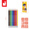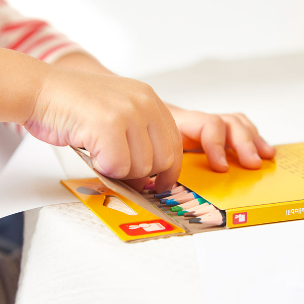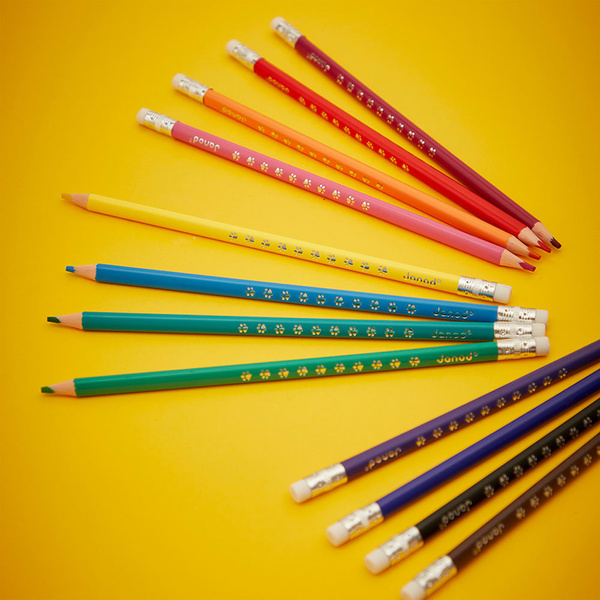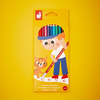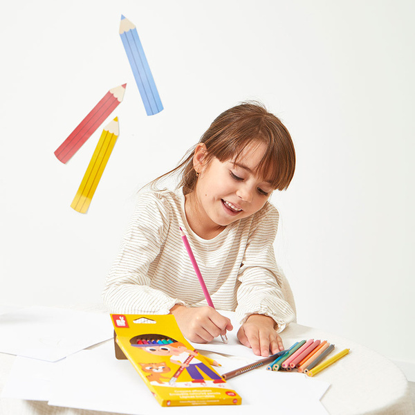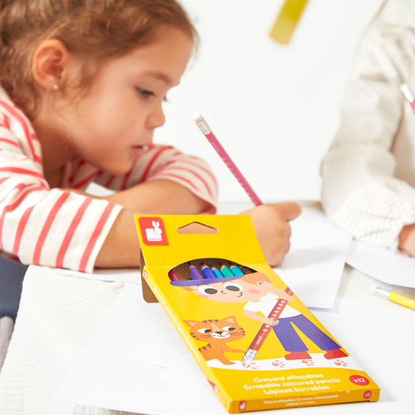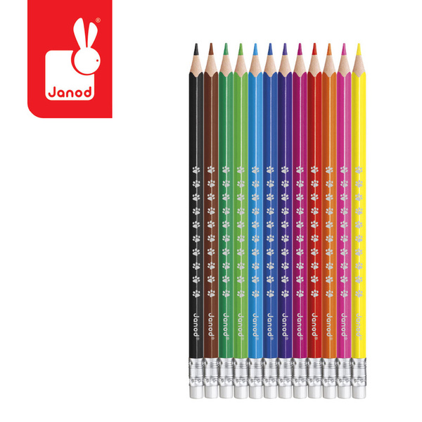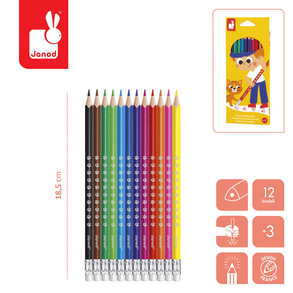 Zestaw 12 kredek ołówkowych francuskiej marki JANOD w pięknych, intensywnych kolorach. Są poręczne (ergonomiczny, trójkątny kształt), łatwe do temperowania i mają (każda) gumkę na końcu, dzięki której da się je zmazać. Zapakowane w estetyczne kartonowe pudełko z dziecięcą grafiką.
