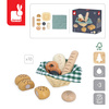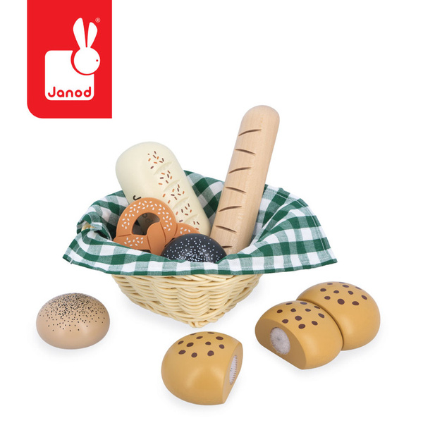 Zestaw zawiera solidny pleciony koszyczek, bawełnianą kraciastą serwetkę oraz 6 różnych rodzajów pieczywa: chleb, precla, bagietkę, czarną bułkę, pszenną bułką z ziarnami oraz 3-częściową chałkę (na rzepy). Zabawkę zaprojektowano we Francji. Zapakowana jest w estetyczne, kartonowe pudełko. Idealnie nadaje się na prezent.
