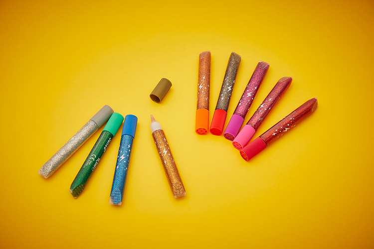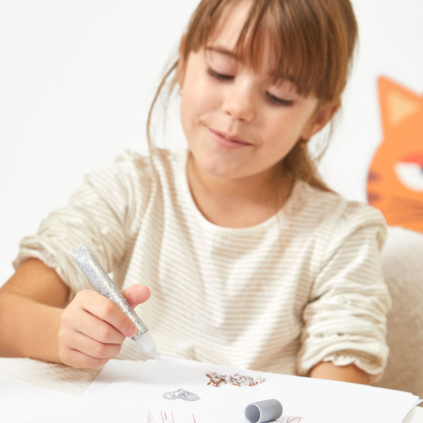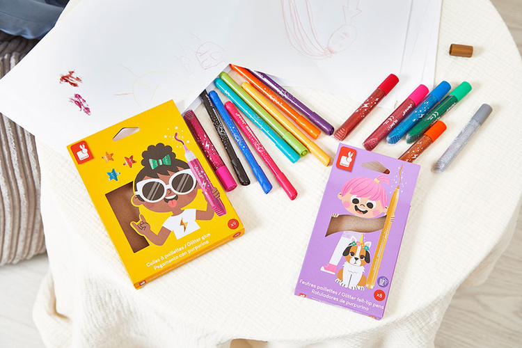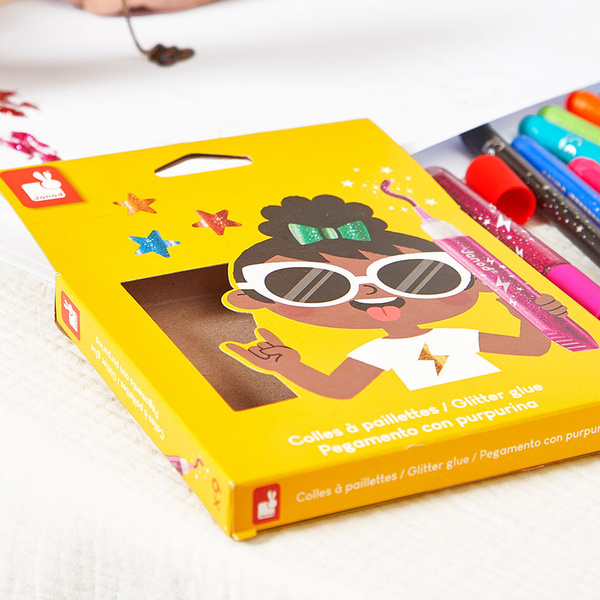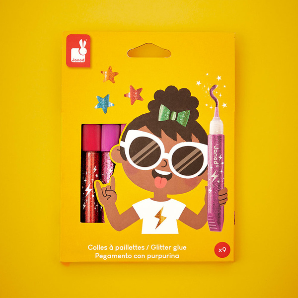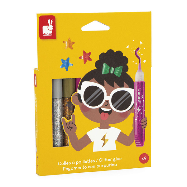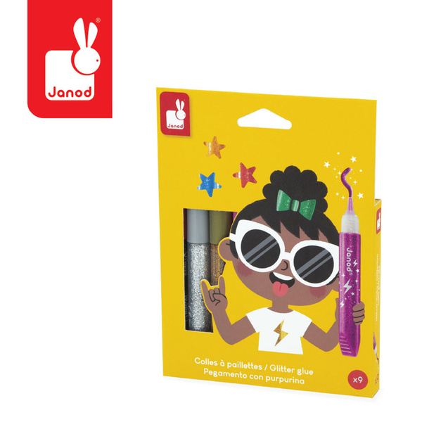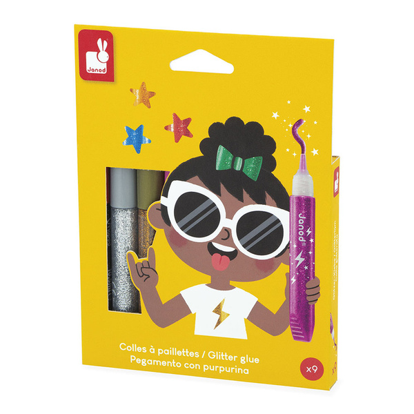 Zestaw 9 brokatowych klejów francuskiej marki JANOD w pięknych kolorach, w tym: złotym, srebrnym, miedzianym i grafitowym z wielobarwnymi drobinkami brokatu. Tubki są poręczne i mają dzióbek, ułatwiający aplikację. Zestaw zapakowany jest w estetyczne kartonowe pudełko z dziecięcą grafiką.