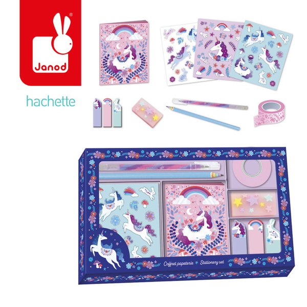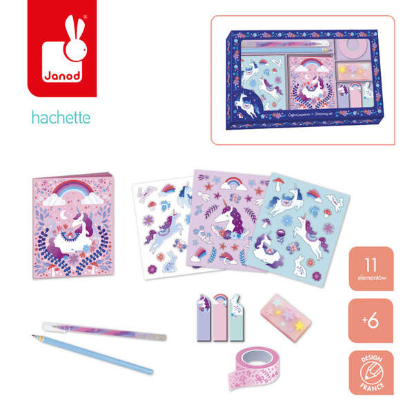 Zestaw piśmienniczy z kolekcji Jednorożce Kraina snów francuskiej marki JANOD zawiera: