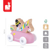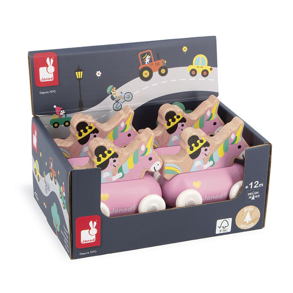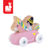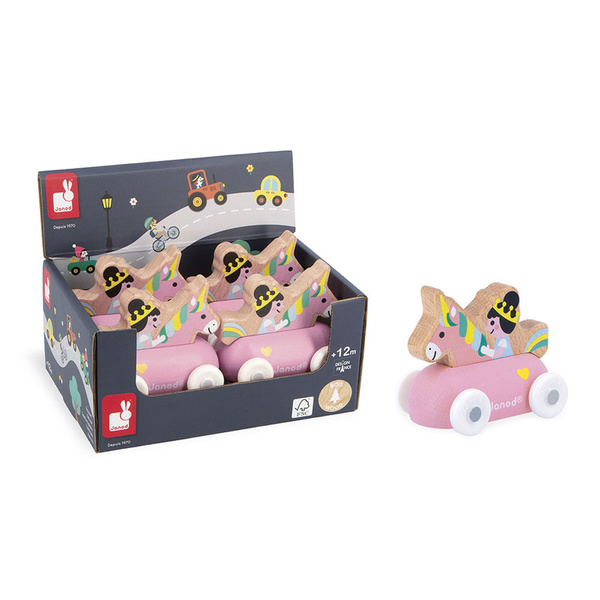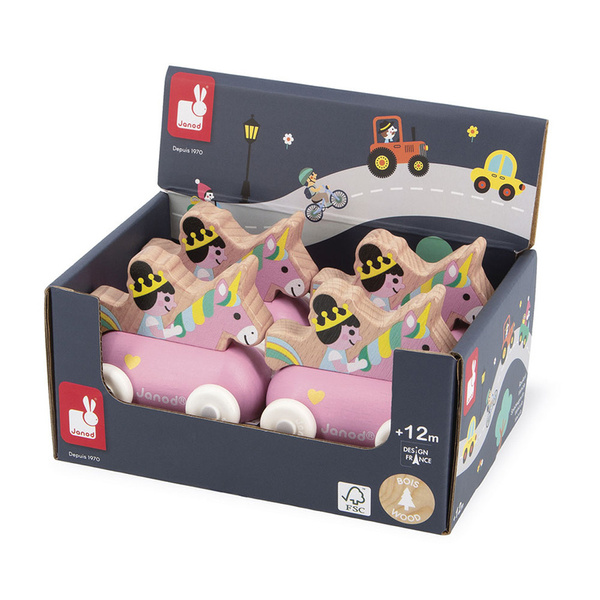 Pojazd z księżniczką i jednorożcem z serii Cross Roads francuskiej marki JANOD to doskonałe uzupełnienie maty-dywanu do zabawy z drogą Zaczarowane królestwo z tej samej kolekcji. Pojazd wykonany jest z drewna, posiada poręczne kształty dopasowane do małych rączek, różowy kolor, a dzięki kółkom łatwo porusza się po różnych powierzchniach. W środku znajdują się księżniczka i jednorożec z tęczową grzywą, co zachęca malucha do snucia własnych historii i kreatywnej zabawy.