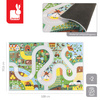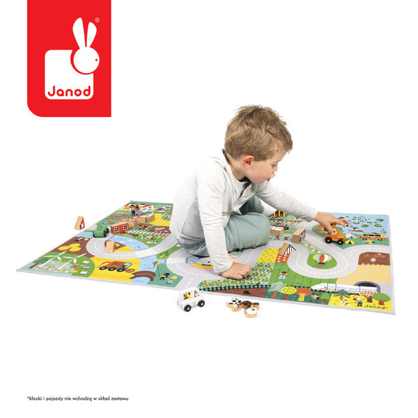 Mata-dywan do zabawy z drogą Wieś z kolekcji Cross Roads francuskiej marki JANOD to idealny prezent dla dzieci już od 2. roku życia. Ma spore rozmiary 120 x 77,5 cm, jest przyjemna w dotyku oraz pozostaje na swoim miejscu, dzięki antypoślizgowej warstwie spodniej. Mata przedstawia bogaty w szczegóły wiejski krajobraz, w którym dziecko może za każdym razem odkrywać coś nowego. Znajdzie w nim różne postacie oraz charakterystyczne dla wsi miejsca m.in. camping nad jeziorem, młyn czy pola uprawne, a wszystkie punkty łączy sieć dróg. Mata Wieś zanurzy maluchy w świecie zwierząt, a elementy, takie jak wiatraki czy ule rozbudzą w nich świadomość zrównoważonego rozwoju.