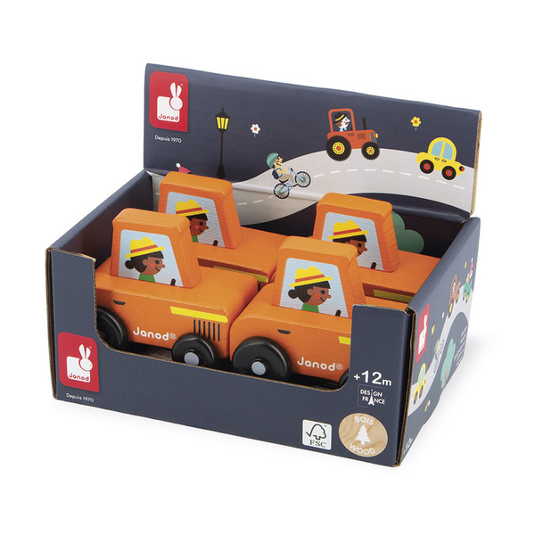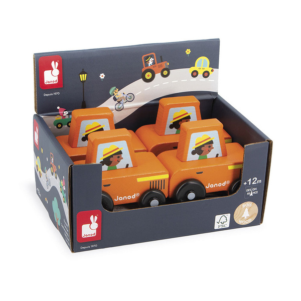 Traktor z serii Cross Roads francuskiej marki JANOD to doskonałe uzupełnienie maty-dywanu do zabawy z drogą Wieś z tej samej kolekcji. Pojazd wykonany jest z drewna, posiada poręczne kształty dopasowane do małych rączek, pomarańczowy kolor, a dzięki kółkom łatwo porusza się po różnych powierzchniach. W środku znajduje się uśmiechnięta rolniczka, co zachęca malucha do snucia własnych historii i kreatywnej zabawy.