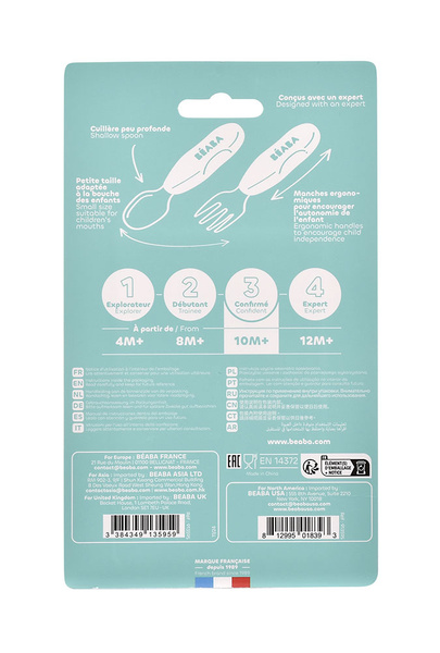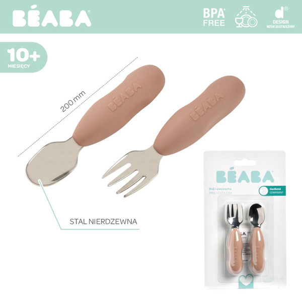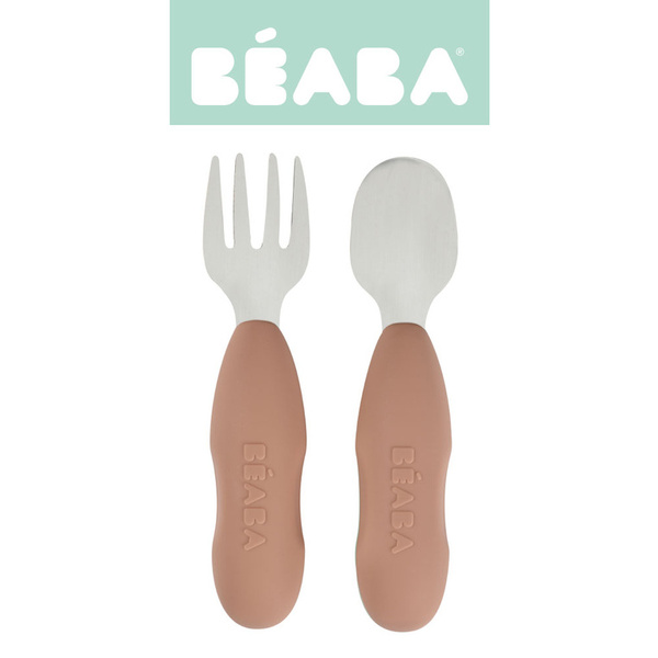 Zestaw innowacyjnych ergonomicznych pierwszych sztućców francuskiej marki BEABA zaprojektowany pod okiem specjalistów od żywienia niemowląt, aby wspierać rozwój i samodzielność maluszków. Łyżeczka i widelec wykonane zostały ze stali nierdzewnej, a ich uchwyt z elastycznego silikonu, w pełni bezpiecznego maluszka. Spłaszczony kształt łyżeczki zapewnia nabieranie optymalnych, małych porcji, dogodnych do połknięcia dla maluszka, widelec zaś ma krótkie, obłe ząbki dla maksymalnego bezpieczeństwa. Ponieważ sztućce są tak samo zbudowane i wyprofilowane z obu stron, nie trzeba ich obracać. Niedługi, zaokrąglony uchwyt z bocznymi wgłębieniami sprawia, że wspierają naukę samodzielnego chwytu już od 10. miesiąca życia (np. dłoniowy, pęsetowy i pięściowy). Nadają się zarówno dla dzieci prawo, jak i leworęcznych.
