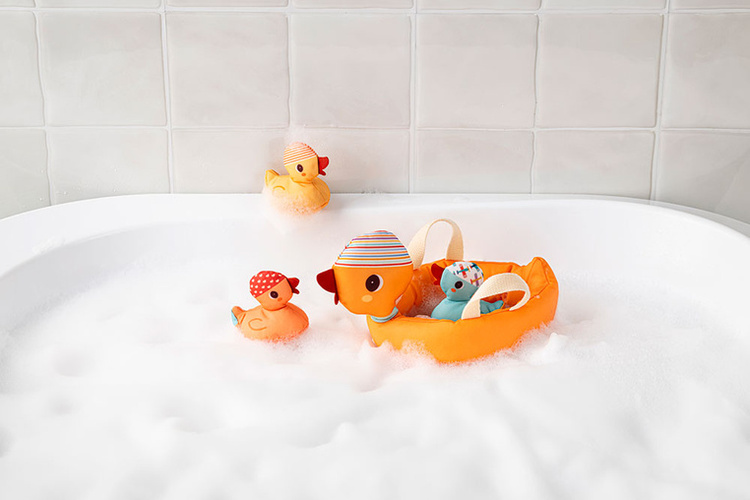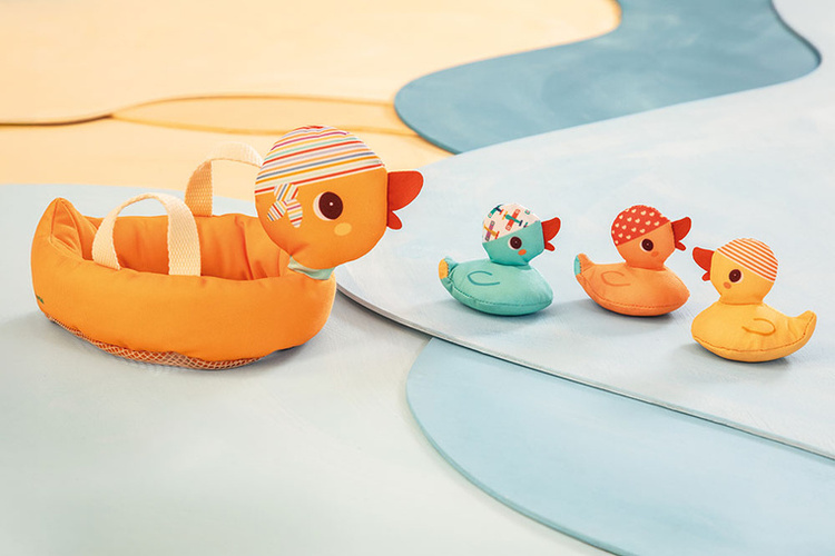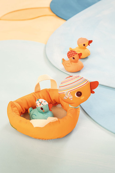 Zestaw 4 kaczek – mamy i jej 3 kaczątek – belgijskiej marki Lilliputiens to idealna zabawka do kąpieli. Wykonane są z miękkiego, łatwego do czyszczenia i szybkoschnącego materiału. Mama kaczka jest jednocześnie koszyczkiem z rączkami oraz łódką dla swoich 3 maluszków. Wszystkie one potrafią też pływać samodzielnie i unoszą się na wodzie. Dodatkowo małe kaczuszki łączą się ze sobą dzięki magnesom, a na ich spodach znajdują się cyfry od 1 do 3. Zabawka jest perfekcyjnie wykończona, z dbałością o każdy szczegół i w pełni bezpieczna dla dziecka. Umila czas spędzony w kąpieli, a przy okazji stymuluje sensorycznie (wystające dzióbki, uchwyty, kolorowe wzory), rozwija sprawność motoryczną (chwyt, wkładanie i wyjmowanie), wyobraźnię (snucie opowieści) oraz wspiera naukę liczenia do 3.