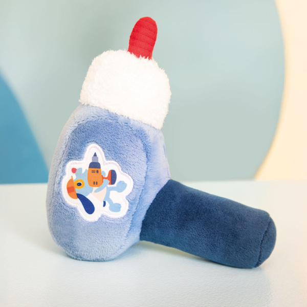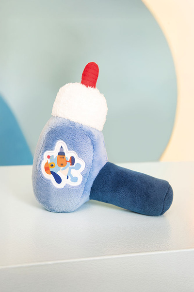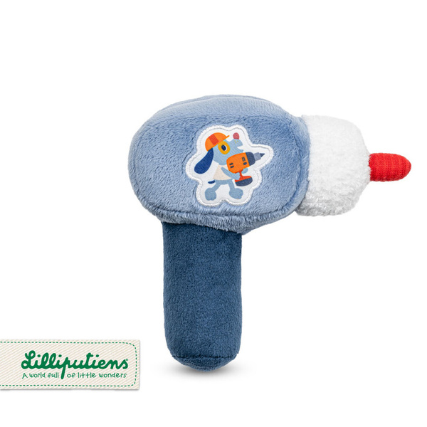 Grzechotka-wiertarka z kolekcji Piesek Jules belgijskiej marki Lilliputiens to aktywizująca zabawka dla niemowląt. Ma postać pluszowej wiertarki z naszywką pieska w kasku. Wewnątrz zabawki znajduje się piszczałka, która przy potrząsaniu wydaje przyjemny dla ucha dźwięk przypominający kwakanie. Jest poręczna i wykonana z różnorodnych materiałów, co dodatkowo stymuluje sensorycznie. Zabawka rozwija małą motorykę (chwytanie i potrząsanie), aktywizuje zmysł słuchu (piszczałka), wzroku i dotyku.
