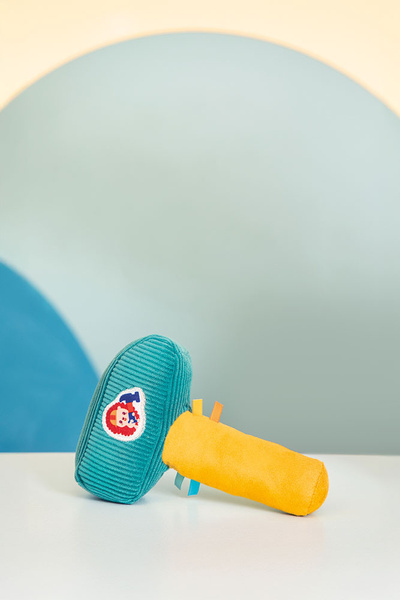 Grzechotka-młotek z kolekcji Jeżyk Leon belgijskiej marki Lilliputiens to aktywizująca zabawka dla niemowląt. Ma postać pluszowego młotka z naszywką jeżyka w kasku. Wewnątrz zabawki znajduje się piszczałka, która przy potrząsaniu wydaje przyjemny dla ucha dźwięk. Jest poręczna i wykonana z różnorodnych materiałów, co dodatkowo stymuluje sensorycznie. Zabawka rozwija małą motorykę (chwytanie i potrząsanie), aktywizuje zmysł słuchu (piszczałka), wzroku i dotyku (ma także wypustki).
