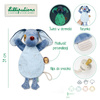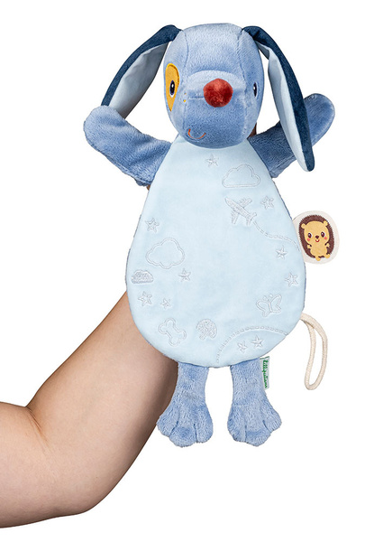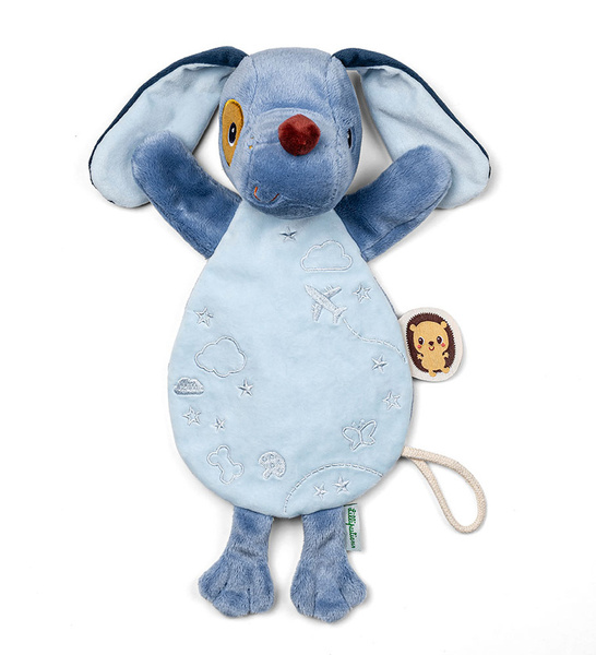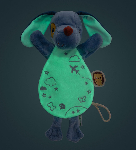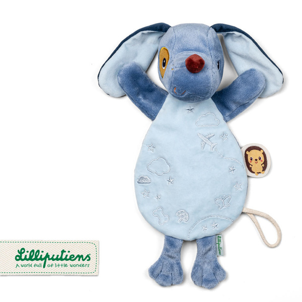 Przytulanka do spania Piesek Jules belgijskiej marki Lilliputiens to wspaniały pierwszy przyjaciel maluszka. Jest idealna do tulenia, uspokajania i usypiania. Ma postać niebieskiego pieska z długimi uszami, sznurkową zawieszką do której można przymocować smoczek oraz z fluorescencyjnymi uszkami i brzuszkiem (świecą w ciemności). Przytulanka jest płaska, więc może pełnić funkcję komfortera, a dzięki otworowi w brzuszku – także pacynki, którą można poruszać i „ożywiać”. Jest solidnie wykonana i bezpieczna. Aktywizuje zmysł dotyku i wzroku, pobudza wyobraźnię, pomaga w zasypianiu i wyciszaniu się.