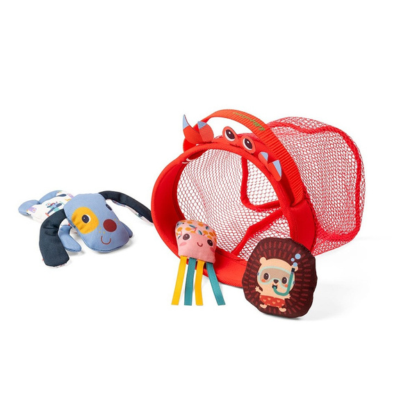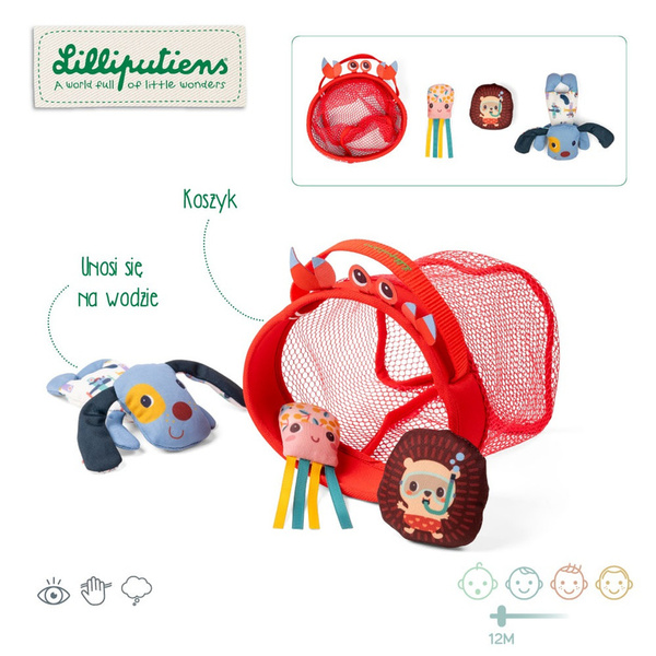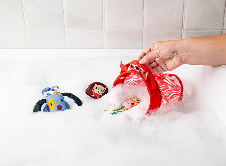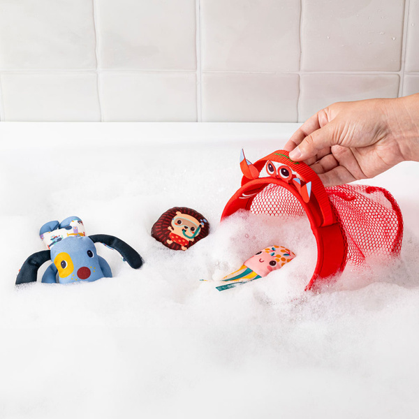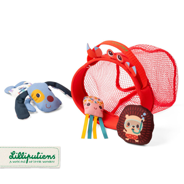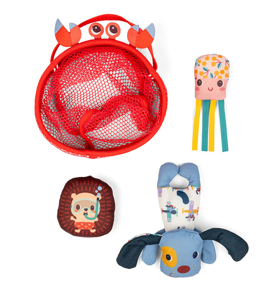 Zestaw zabawek z siecią rybacką z kolekcji Piesek Jules belgijskiej marki Lilliputiens to idealna zabawka do kąpieli. Wykonane są z miękkiego, łatwego do czyszczenia i szybkoschnącego materiału. Czerwona przestronna sieć ma krabie oczy i szczypce oraz wygodny uchwyt. Można do niej łapać i przechowywać w niej dołączone do zestawu stworzenia: meduzę z tasiemkami sensorycznymi, nurkującego Jeża Leona oraz pływającego Pieska Julesa. Wszystkie one unoszą się na wodzie. Zabawka jest perfekcyjnie wykończona, z dbałością o każdy szczegół i w pełni bezpieczna dla dziecka. Umila czas spędzony w kąpieli, a przy okazji stymuluje sensorycznie (wystające elementy, uchwyty), rozwija sprawność motoryczną (chwyt, wkładanie i wyjmowanie, łowienie), logiczne myślenie (dostrzeganie związków przyczynowo-skutkowych) oraz wyobraźnię (snucie opowieści).