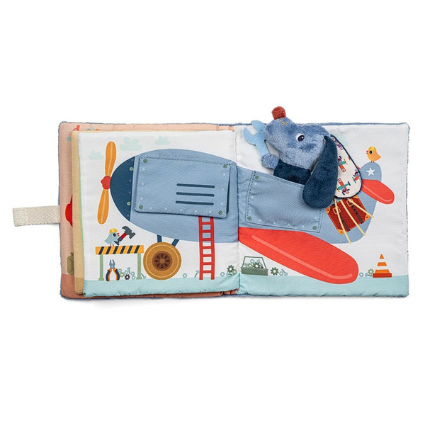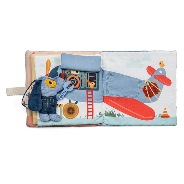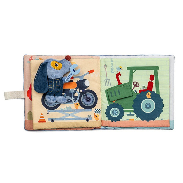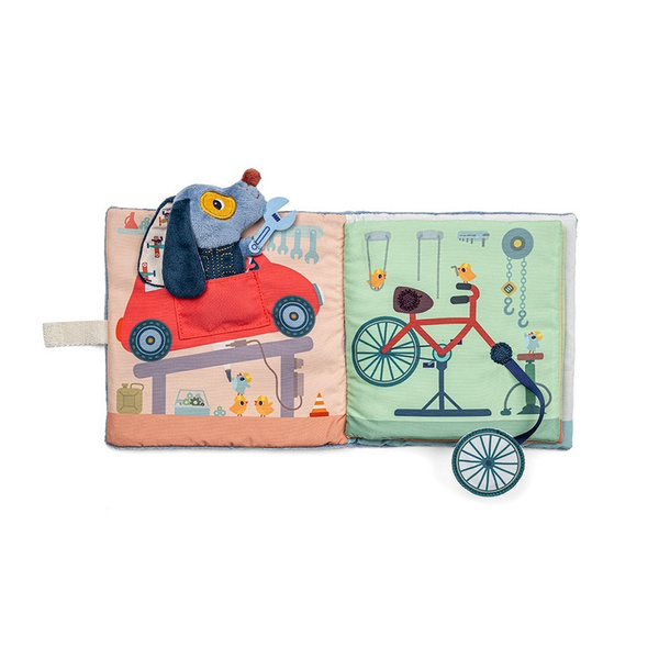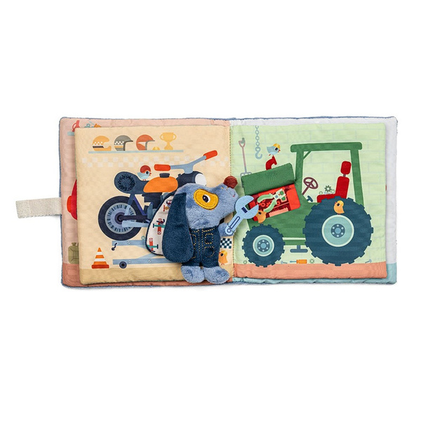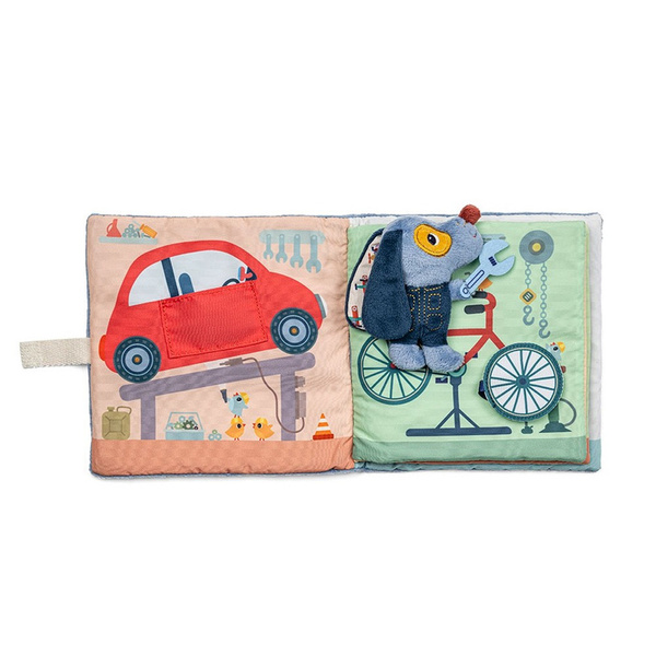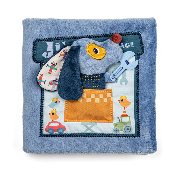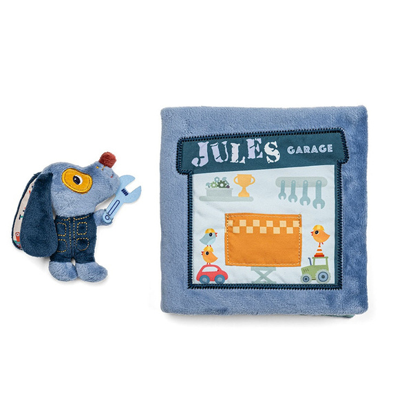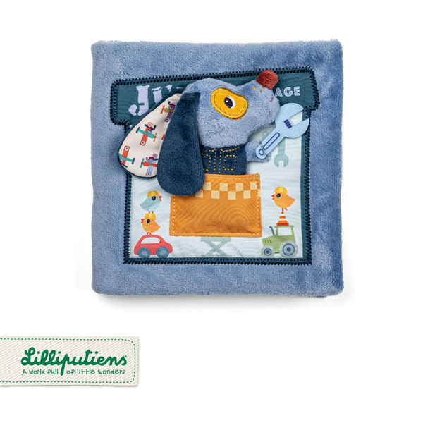 Książeczka Garaż Pieska Jules'a belgijskiej marki Lilliputiens to idealna pierwsza lektura dla maluszka. Na okładce znajduje się wnętrze garażu ze skrzynią-kieszonką, w której można umieścić dołączoną do książeczki mini-przytulankę – Pieska Julesa z kluczem nastawnym. Ponadto okładka szeleści przy pocieraniu. Każda ze stron książeczki przedstawia inny pojazd w trakcie naprawy, m.in.: rower, traktor czy samolot. Książeczkę uatrakcyjniają kieszonki, odchylane i odczepiane na rzep elementy. Kolorowe obrazki doskonale nadają się do snucia opowieści i łatwo zapadają w pamięć. Książeczka jest zapinana na rzep i bezpieczna dla dziecka. Pobudza wyobraźnię i ciekawość, aktywizuje zmysły. Jest także świetnym sposobem na zaszczepienie w maluszku miłości do książek oraz oswojenia go z majsterkowaniem.