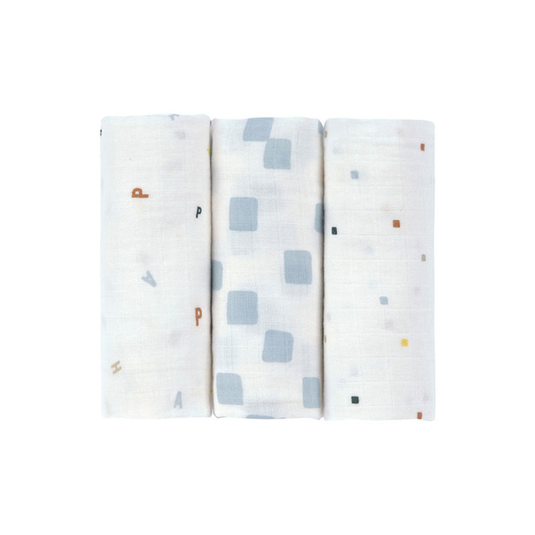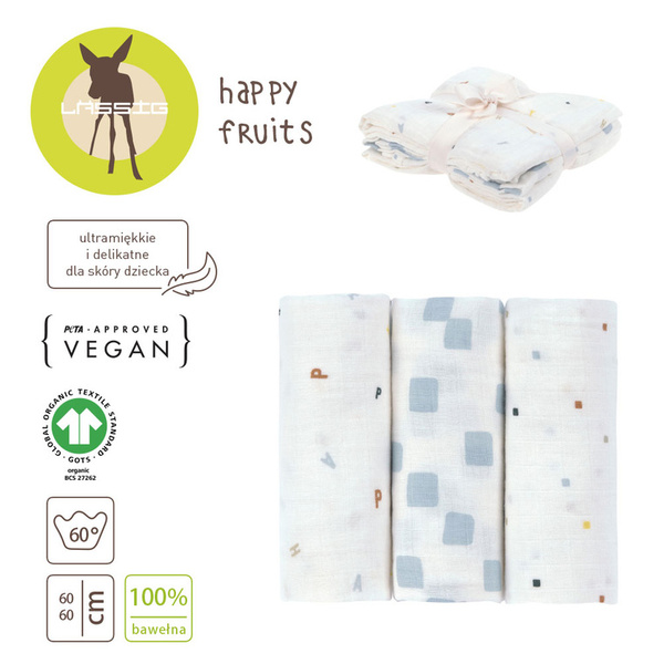 Komplet trzech wielofunkcyjnych bawełnianych pieluszek otulaczy z kolekcji Happy Fruits niemieckiej marki LASSIG. Jeden w kolorowe literki tworzące słowo HAPPY, drugi w małe kolorowe kwadraciki, a trzeci we wzór biało-błękitnej kraty. Kocyki mają wygodne rozmiary – 60x60 cm – i mogą być używane np. do owijania maluszka, jako pieluszka do odbijania po karmieniu, okrycie podczas letniej drzemki, osłona do wózka, jako prześcieradełko, chusta do karmienia i na wszelkie inne sposoby według potrzeb. Są jednowarstwowe, przewiewne i delikatne dla skóry. Dzięki kompletowi 3 sztuk rodzic ma potrzebny otulacz zawsze pod ręką.