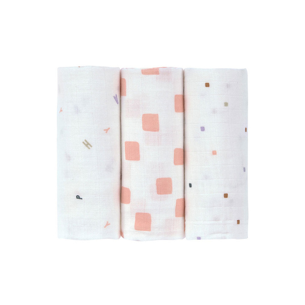 Komplet trzech wielofunkcyjnych bawełnianych pieluszek otulaczy z kolekcji Happy Fruits niemieckiej marki LASSIG. Jeden w kolorowe literki tworzące słowo HAPPY, drugi w małe kolorowe kwadraciki, a trzeci we wzór biało-różowej kraty. Kocyki mają wygodne rozmiary – 60x60 cm – i mogą być używane np. do owijania maluszka, jako pieluszka do odbijania po karmieniu, okrycie podczas letniej drzemki, osłona do wózka, jako prześcieradełko, chusta do karmienia i na wszelkie inne sposoby według potrzeb. Są jednowarstwowe, przewiewne i delikatne dla skóry. Dzięki kompletowi 3 sztuk rodzic ma potrzebny otulacz zawsze pod ręką.