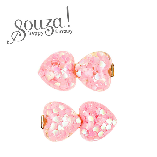 Komplet dwóch spinek do włosów z sercami Quirine holenderskiej marki Souza! Na każdej z nich znajdują się po dwa epoksydowe serca, wypełnione różowym, serduszkowym konfetti. Metalowa część spinek jest złota. Ząbkowane zaciski sprawiają, że ozdoby stabilnie trzymają się włosów. Idealne zarówno na przyjęcia, jak i na co dzień. Nadają się także na prezent.
