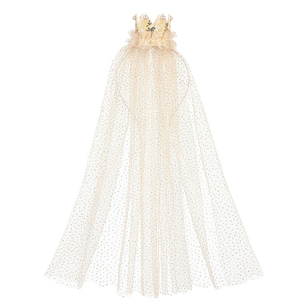 Opaska z welonem i mini-koroną Chava holenderskiej marki Souza! jest owinięta jasną wstążką. Zdobi ją długi tiulowy welon w złoty print, a u góry trójwymiarowa złota korona z tiulowym upięciem, cekinami i perełkami. Jest lekka, delikatna i przyjemna w noszeniu (ma optymalną szerokość – 0,5 cm – i nie uciska). Idealna na przyjęcia i jako uzupełnienie przebrania księżniczki. Sprawdzi się także jako stylowy prezent.