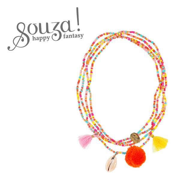 Naszyjnik 4w1 Sylvie holenderskiej marki Souza! składa się z czterech rzędów drobnych kolorowych koralików o długości 40 cm. Na każdym znajduje się inna zawieszka: żółty chwościk, jasnoróżowy chwościk, muszelka i pomarańczowy pomponik. Naszyjniki są elastyczne i wygodne do nakładania. Biżuteria jest nietoksyczna i nie podrażnia skóry. Idealna zarówno na przyjęcia, jak i do noszenia na co dzień. Sprawdzi się także jako stylowy prezent.