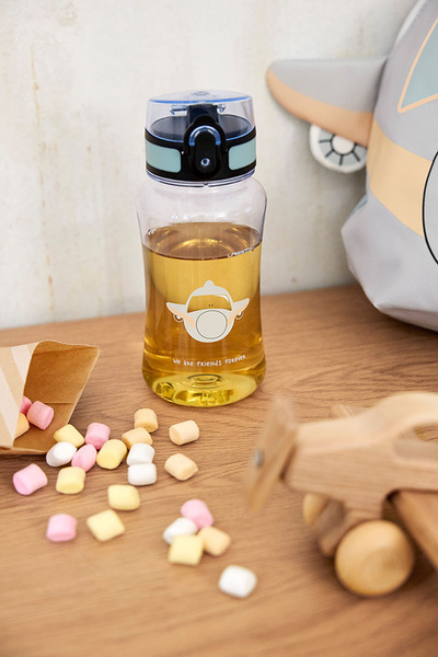 Na bidonie znajduje się napis "we are friends forever" oraz grafika samolotu.