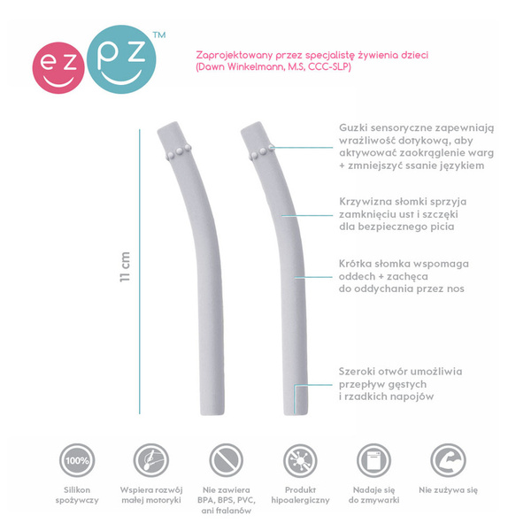 Dwie dodatkowe silikonowe słomki dedykowane są do kubeczka Mini Cup jako praktyczne akcesorium, ułatwiające korzystanie z naczynka. Słomki zostały zaprojektowane przez specjalistę w dziedzinie logopedii i żywienia tak, aby ułatwić maluszkowi naukę samodzielnego picia. Ich unikalny kształt jest doskonale dopasowany do ust i potrzeb małego człowieka. Wygięcie oraz sensoryczne wypustki w górnej części aktywują automatyczne domknięcie warg i szczęki, a optymalna długość wspiera naukę oddychania przez nos i normalizacji oddechu. Kolejnym etapem, po opanowaniu umiejętności picia przez zakrzywiony koniec słomki, jest nauka picia przez prostą słomkę – do tego służy drugi koniec bez wypustek. Szeroki przepływ (średnica słomki to niemal 1 cm!) umożliwia spożywanie napojów o zróżnicowanej gęstości. Co ważne, zaokrąglanie warg podczas używania słomki sprzyja postępom w kształtowaniu się i używaniu aparatu mowy.