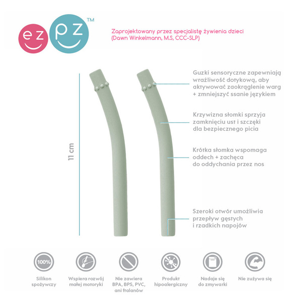 Dwie dodatkowe silikonowe słomki dedykowane są do kubeczka Mini Cup jako praktyczne akcesorium, ułatwiające korzystanie z naczynka. Słomki zostały zaprojektowane przez specjalistę w dziedzinie logopedii i żywienia tak, aby ułatwić maluszkowi naukę samodzielnego picia. Ich unikalny kształt jest doskonale dopasowany do ust i potrzeb małego człowieka. Wygięcie oraz sensoryczne wypustki w górnej części aktywują automatyczne domknięcie warg i szczęki, a optymalna długość wspiera naukę oddychania przez nos i normalizacji oddechu. Kolejnym etapem, po opanowaniu umiejętności picia przez zakrzywiony koniec słomki, jest nauka picia przez prostą słomkę – do tego służy drugi koniec bez wypustek. Szeroki przepływ (średnica słomki to niemal 1 cm!) umożliwia spożywanie napojów o zróżnicowanej gęstości. Co ważne, zaokrąglanie warg podczas używania słomki sprzyja postępom w kształtowaniu się i używaniu aparatu mowy.