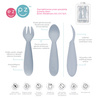 Komplet pierwszych silikonowych sztućców do nauki samodzielnego jedzenia Mini Utensils przeznaczony jest dla dzieci od 12. miesiąca życia (w zależności od zaleceń lekarza pediatry). Innowacyjny zestaw zawiera łyżeczkę i widelczyk zaprojektowane przez specjalistę w dziedzinie logopedii i żywienia dzieci, dzięki czemu ich kształt został idealnie dopasowany do ust małego dziecka. Dodatkowo używanie dwóch rodzajów sztućców zwiększa świadomość sensoryczną malucha, wspiera rozwój aparatu mowy i małej motoryki – trenuje chwytanie, nabieranie (łyżka) oraz przekłuwanie (widelec). Główki obu sztućców mają optymalną wielkość, a trzy ząbki widelca są odpowiednio szerokie, dzięki czemu zestaw jest całkowicie bezpieczny dla delikatnych dziąseł maluszka. Miękki materiał chroni wyrzynające się ząbki, a lekkie wygięcie pomaga w nauce domykania warg. Odpowiednio krótkie, dość grube, zaokrąglone i antypoślizgowe uchwyty zostały wyprofilowane tak, by sztućce były łatwe do trzymania w małych rączkach. Dodatkowe wypustki pod spodem uchwytów stabilizują leżące sztućce.