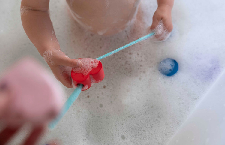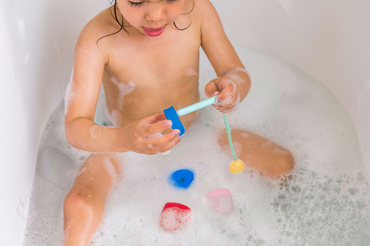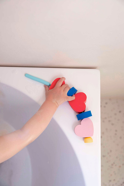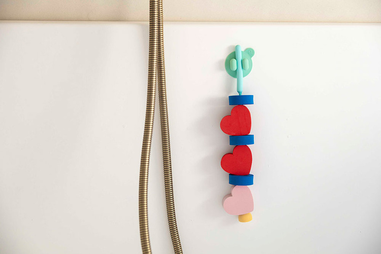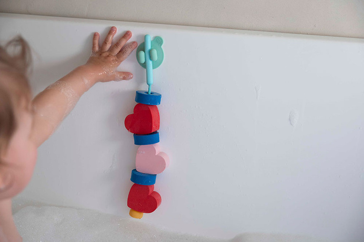 Zestaw składa się z 6 elementów w kształcie serc i kółek, wykonanych z lekkiej, szybkoschnącej i unoszącej się na wodzie pianki EVA. Klockami można bawić się na wiele sposobów – budować z nich wieże na powierzchni wanny, przyczepiać do ścian łazienki (od ok. 10. miesiąca życia), a także nawlekać na dołączony sznurek z miękką blokadą i bezpiecznym patyczkiem (od ok. 18. miesiąca życia). W komplecie znajduje się również uchwyt z przyssawką, umożliwiający zawieszenie gotowej pracy w łazience.