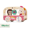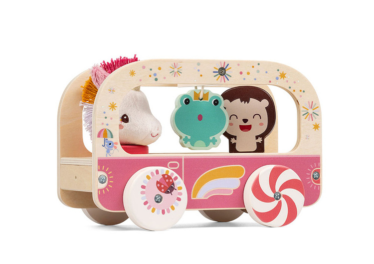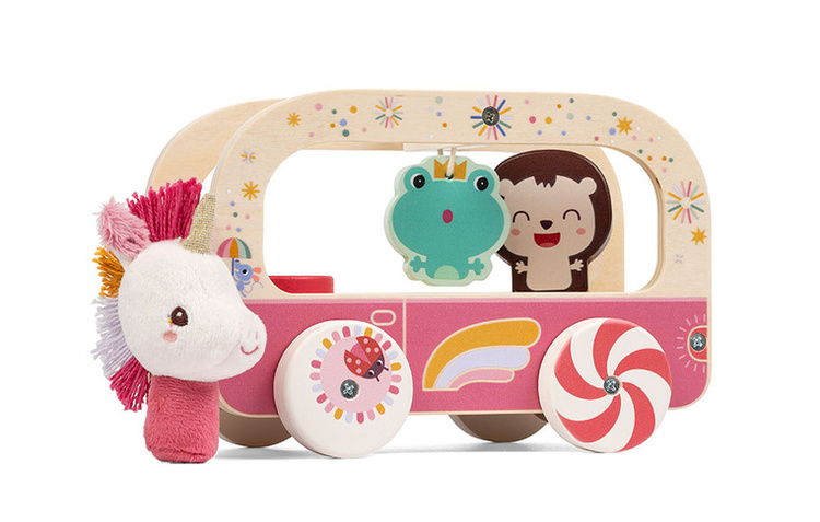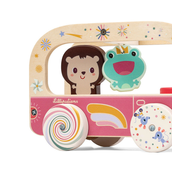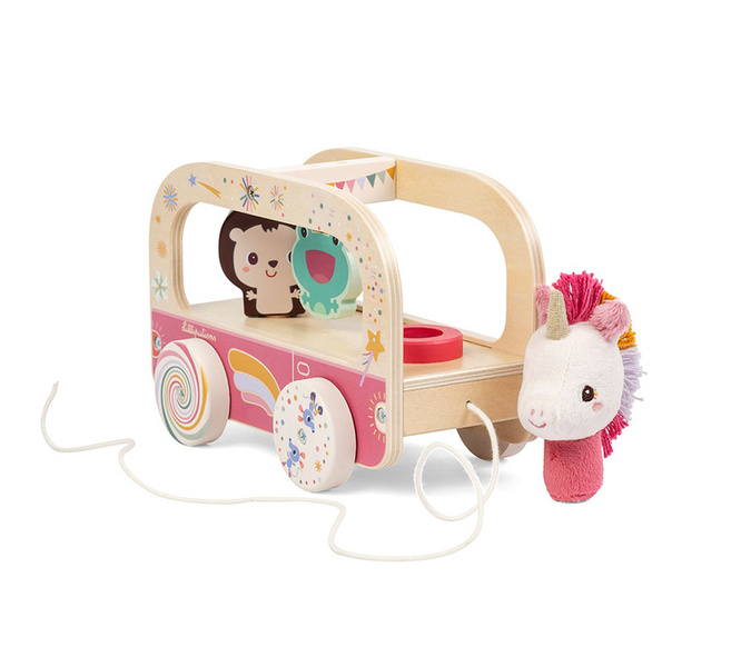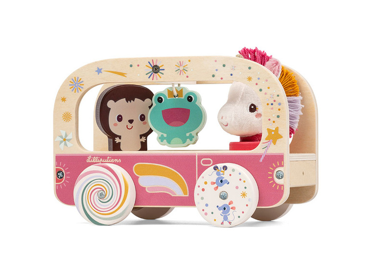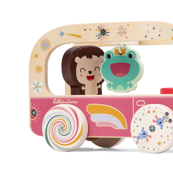 Drewniany pojazd do ciągnięcia z kolekcji Jednorożec Lena belgijskiej marki Lilliputiens to niebanalna zabawka, która wspiera dziecko w rozwoju ruchowym i pobudza wyobraźnię. Kolorowy autobus ma obłe kształty, jest otwarty i przewozi trzech wyjątkowych pasażerów: drewnianego Jeżyka Leona, który obraca się podczas jazdy, żabkę huśtającą się na sznureczku oraz pluszowego Jednorożca Lenę, którą można wyciągać i wkładać na miejsce kierowcy. Pojazd jest łatwy do prowadzenia – można go ciągnąć na sznureczku (z możliwością odczepienia) lub pchać. Dodatkowo kółka autobusu tworzą ciekawe efekty wizualne w ruchu.