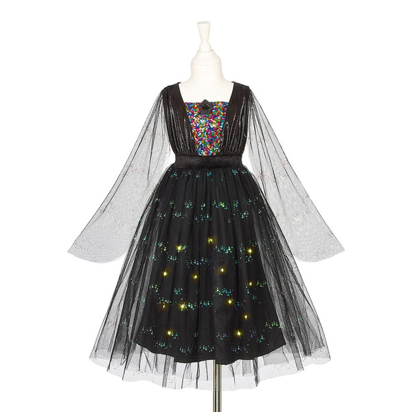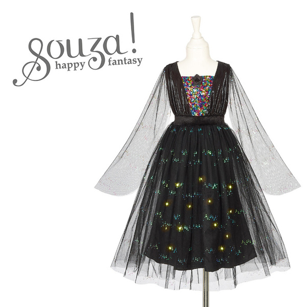 Kostium sukienka z lampkami LED czarownica Agatha holenderskiej marki Souza! to przepiękne i kunsztownie wykonane przebranie dla dziewczynki, które zachwyca dbałością o detale. Sukienka ma klasyczny krój z długimi tiulowymi rękawami, częściowo ozdobionymi cekinami. Góra wykonana jest z różnych materiałów i zdobiona wstawką z kolorowych cekinów na dekolcie. Wielowarstwowa czarna spódnica posiada natomiast: wierzchnią warstwę tiulu ozdobioną cekinami, odpinaną warstwę z przewodem i bezpiecznymi lampkami LED oraz satynową podszewkę zapewniającą wygodę. Dzięki gumce w pasie sukienka jest wygodna i komfortowa w noszeniu.