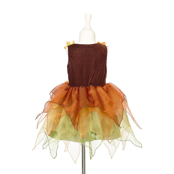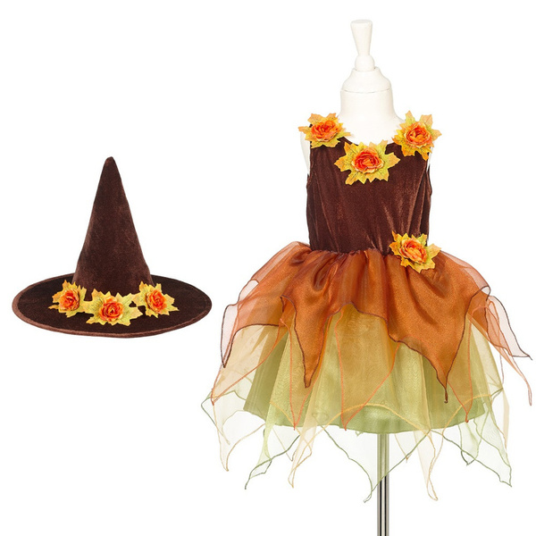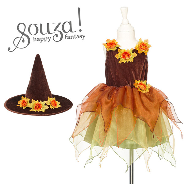 Kostium sukienka z kapeluszem czarownica Sabrina holenderskiej marki Souza! to przepiękne, kunsztownie wykonane przebranie dla dziewczynki. Zachwyca dbałością o detale, ma klasyczny krój i gumkę w pasie, która zapewnia komfort noszenia. Welurowa góra ma rdzawo-brązowy kolor i trzy jesienne kwiaty przy dekolcie. Wielowarstwowy, krótki dół ma jasnozieloną satynową podszewkę oraz ząbkowane tiulowe spódniczki w odcieniach zieleni, żółci i pomarańczu. Kwiat zdobi także pas sukienki oraz szerokie rondo welurowego stożkowego kapelusza, który znajduje się w zestawie. To idealny kostium na bal przebierańców, Halloween czy Sylwestra. Sprawdzi się także jako prezent.