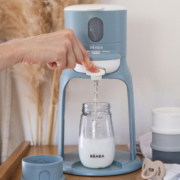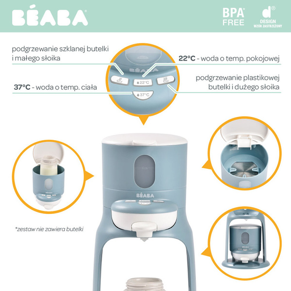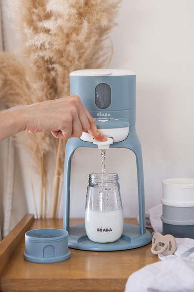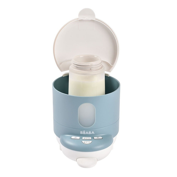 W górnej części znajduje się pojemnik do podgrzewania wody z praktycznym okienkiem do podglądu jej poziomu. Wodę można podgrzać do temperatury pokojowej, tj. 22°C lub temperatury ciała, tj. 37°C. Następnie wystarczy podstawić pod spód butelkę z sypkim mlekiem modyfikowanym, nacisnąć przycisk i gotowe. Precyzję i wygodę procesu zapewnia system Direct Water Control®.
