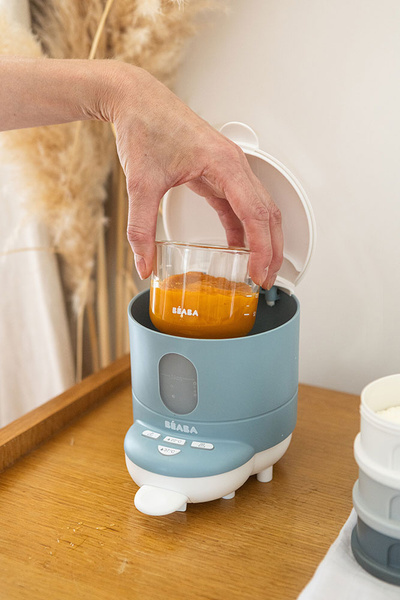 Bib’expresso® może również pełnić rolę podgrzewacza – bez problemu ogrzeje butelki lub słoiczki o pojemności od 90 do 380 ml pojemności. Wystarczy wstawić je do zbiornika z wodą i wybrać – w zależności od potrzeb – jeden z dwóch stopni podgrzewania: do 70°C (w przypadku szklanych butelek i mniejszych słoiczków) lub do 90° (do butelek plastikowych i słoiczków o większej pojemności). Mniejszy posiłek podgrzany jest już w 30 s, większy – w maks. 2 min. O zakończeniu każdego cyklu informuje sygnał dźwiękowy.