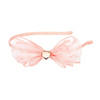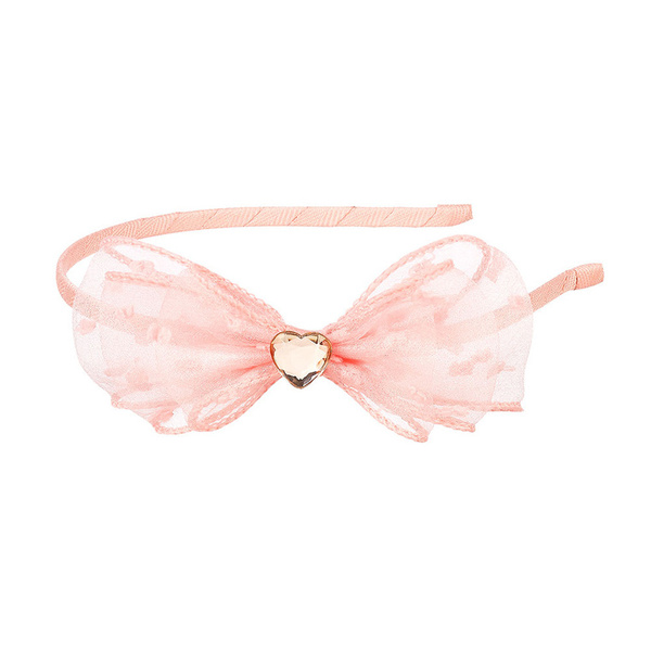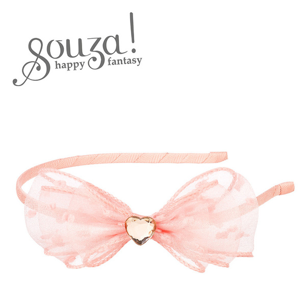 Opaska z kokardą Leah holenderskiej marki Souza! Obciągniętą ryflowaną wstążką, cienką (0,5 cm), metalową opaskę zdobi spora różowa kokarda z tiulu oraz złote serduszko-kryształek. Opaska jest lekka, delikatna i przyjemna w noszeniu (nie uciska). Idealna zarówno na przyjęcia, jak i na co dzień. Sprawdzi się także jako stylowy prezent.