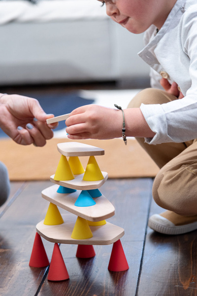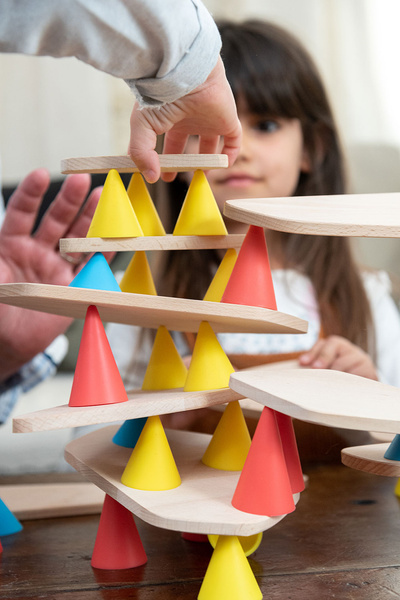 W tej wersji główną zasadą gry jest… brak zasad, a zadaniem dla dzieci – budowanie, tak po prostu. Warto pamiętać, żeby, niezależnie od tego, co podpowie twórcom wyobraźnia, dolną deseczkę podtrzymywały co najmniej trzy stożki – zapewni to większą stabilność całej konstrukcji.