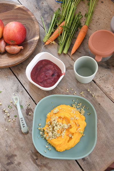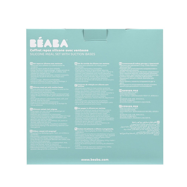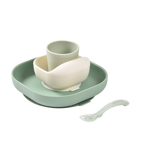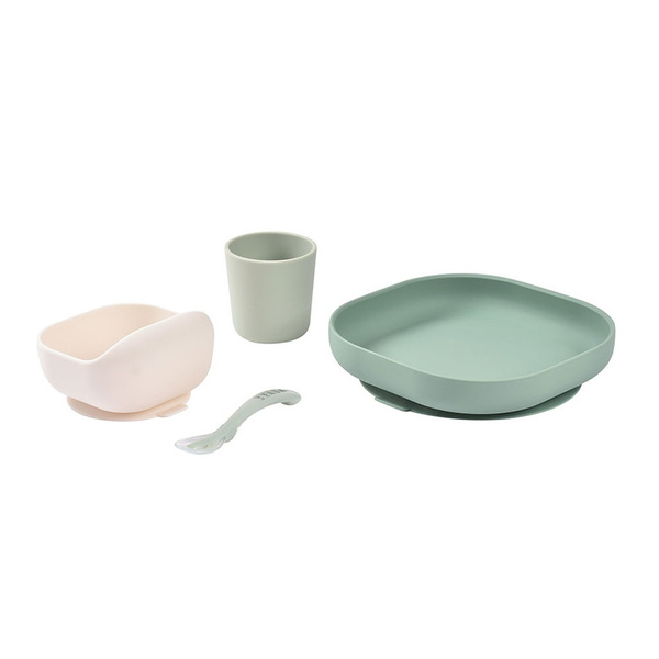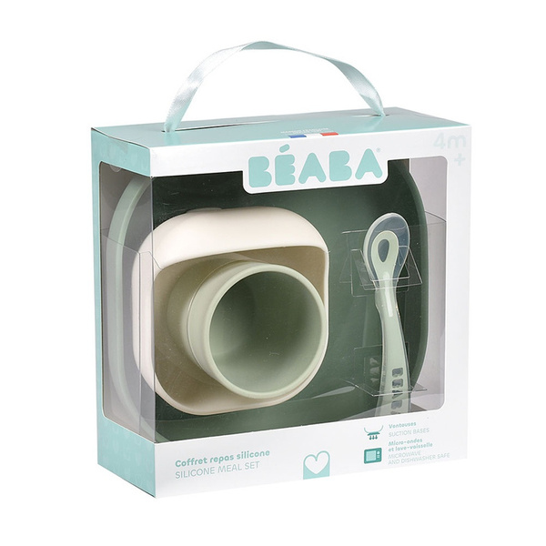 Komplet naczyń z silikonu francuskiej marki BEABA składa się z talerzyka, miseczki, kubka i łyżeczki treningowej. Talerzyk i miseczka posiadają kwadratowy kształt z wysokimi, zaokrąglonymi po bokach brzegami, co wspiera dziecko w nauce samodzielnego jedzenia. Dodatkowo, jedna z krawędzi miseczki jest wyższa i delikatnie zakrzywiona do wewnątrz, co dodatkowo ułatwia dziecku samodzielne nabieranie posiłku na łyżkę. Naczynia mają na spodzie antypoślizgową przyssawkę, dzięki czemu są stabilne i dobrze trzymają się stołu. Kubeczek jest poręczny i wygodny do nauki picia, a łyżeczka idealnie dopasowuje się do dziecięcej buzi i można ją odłożyć tak, by główka nie dotykała powierzchni, dzięki czemu jej używanie jest o wiele bardziej higieniczne.