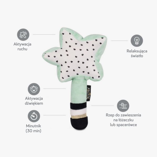 Ta fantastyczna magiczna różdżka w kształcie gwiazdki jest idealnym nocnym towarzyszem Twojego dziecka, ponieważ jej delikatne, relaksujące światełko uspokaja dziecko w ciemności, przywracając spokojny sen.