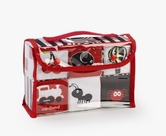 Małe klocki do układania w stos o stymulujących zmysły wzorach i kolorach. Miękka struktura klocków ułatwia dzieciom ich chwytanie. W każdym klocku wewnątrz znajduje się grzechotka.