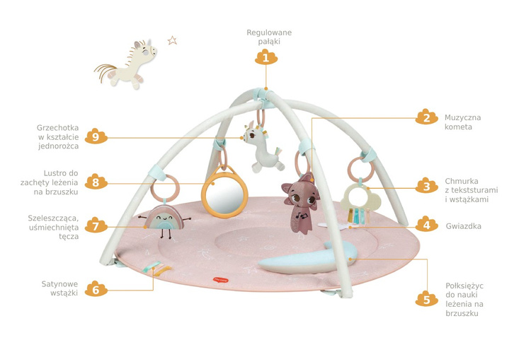 zawiera liczne urocze zabawki, aktywujące rozwój Twojej pociechy, bezpieczne lusterko, oraz elementy świecące i grające