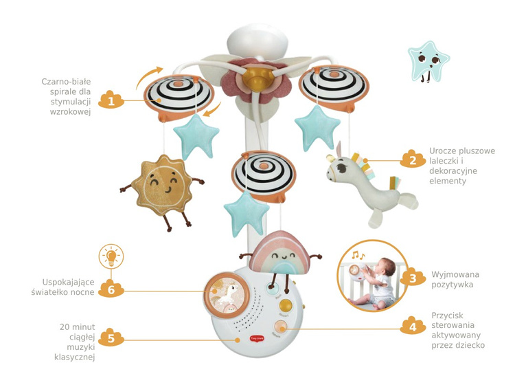Ciesz się tym w jaki sposób karuzela angażuje dziecko do odkrywania oraz uspokaja i wycisza gdy przychodzi czas na spanie.