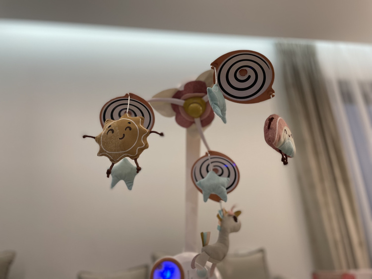 Oczy uśmiechniętych postaci oraz powolny ruch spirali wraz z włączoną relaksującą muzyką klasyczną stymuluje zmysły dziecka - wzroku i słuchu.