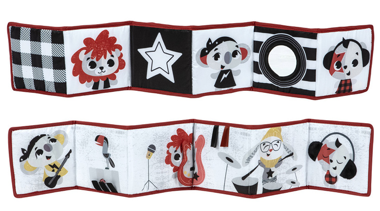 Kontrastująca czarno-biała strona została stworzona, aby już od narodzin wspierać wzrok dziecka. Kolorowa strona, z większą ilością detali, jest wyposażona w różnorodne elementy, które oferują stymulację zmysłu wzroku i dotyku starszego dziecka. Obie strony książeczki wspierają rozwój twojego rosnącego maluszka.