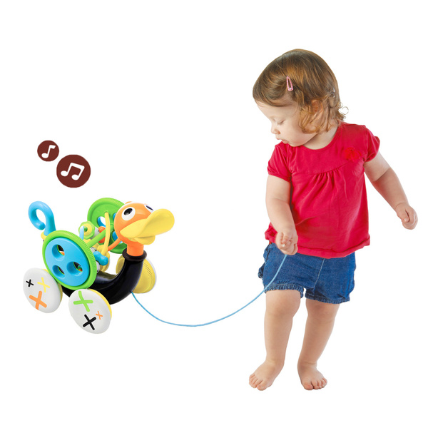 Gdy dziecko ciągnie kaczkę za sznurek, ta gwiżdże i śpiewa, a kolorowy walec z koralikami obraca się na jej grzbiecie. Po zatrzymaniu – dźwięk cichnie, ucząc związku przyczyna–skutek. Walec można zdjąć i bawić się nim osobno. Po chwili bezczynności kaczka zaczyna nawoływać dziecko – dźwięki pojawiają się coraz rzadziej i po 10 minutach cichną całkowicie.