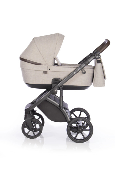 Bloom posiada regulowane oparcie do pozycji leżącej w wersji spacerowej, regulowany podnóżek odpinaną barierkę, obszytą eko-skórą.