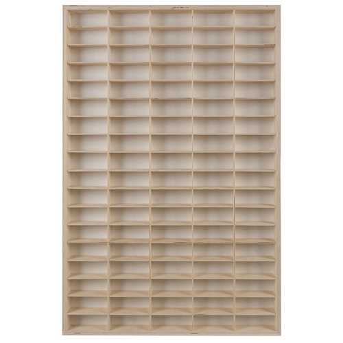 SPECYFIKACJA – kolor: sosna; materiał: drewniana sklejka; ilość przegródek: 90; wielkość przegródki: 5 x 9,3 x 5 cm; wymiary: 78,5 x 50 x 5,3 cm; waga: 2,75 kg; waga w opakowaniu: 3,2 kg.