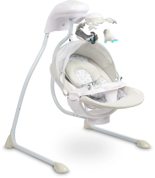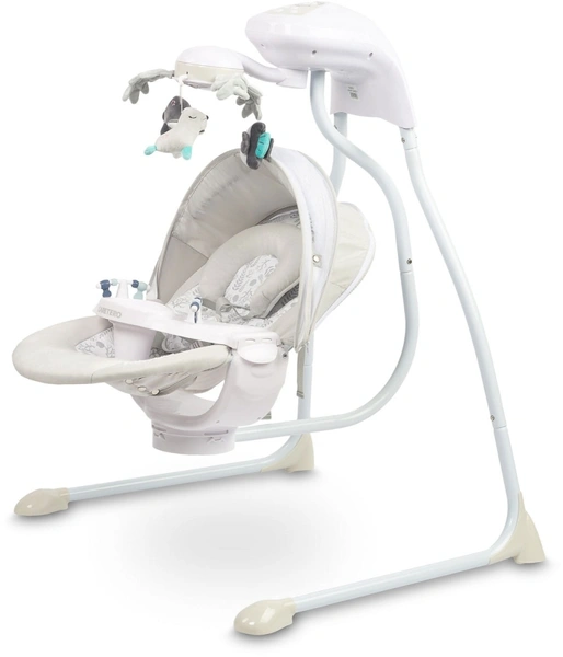 Huśtawka posiada karuzelkę, zapewniającą maluszkowi dodatkową rozrywkę. Światełka, melodyjki, oraz przywieszone zabawki będą źródłem zabawy i radości. Poza tym, huśtawkę wyposażono w czasomierz oraz funkcję zmiany prędkości bujania, czym steruje rodzic.