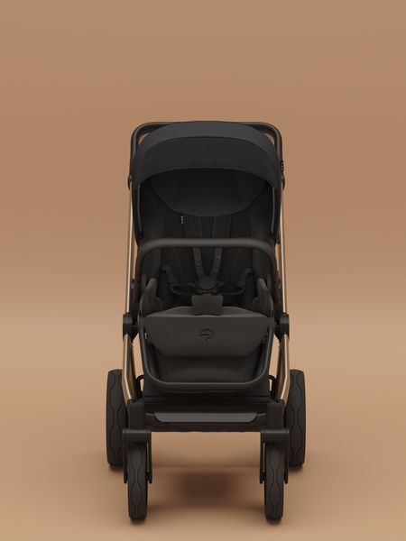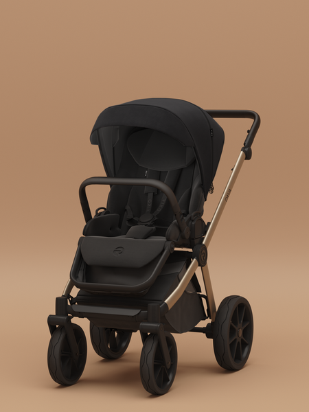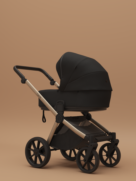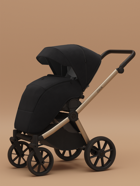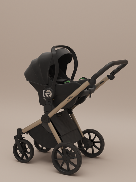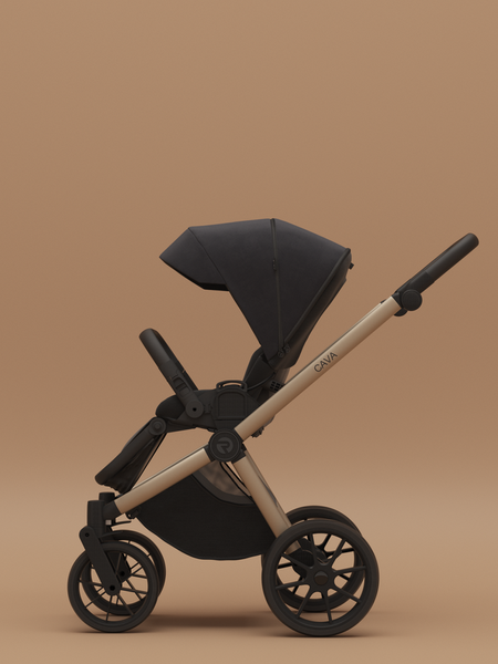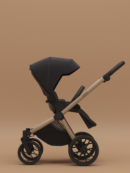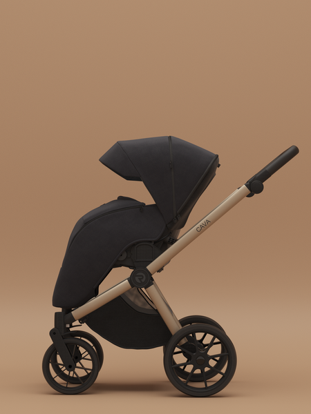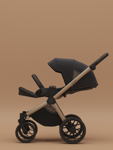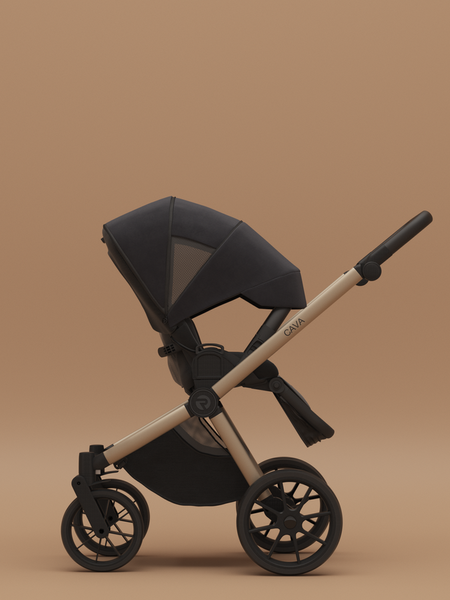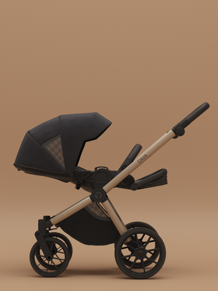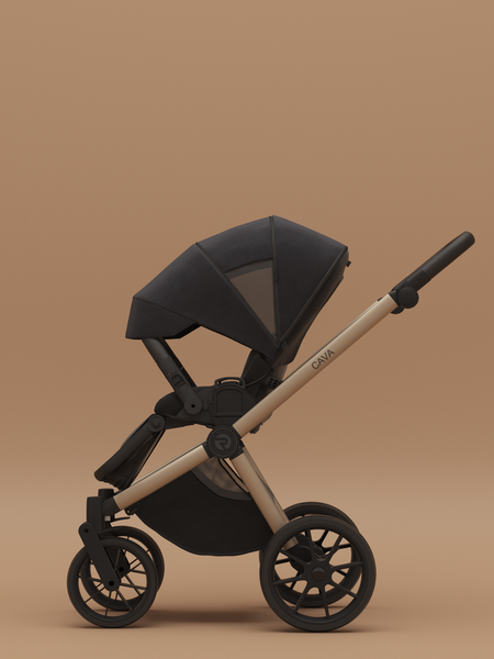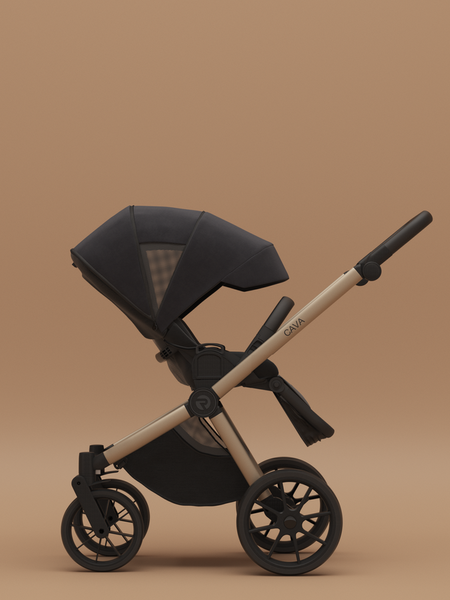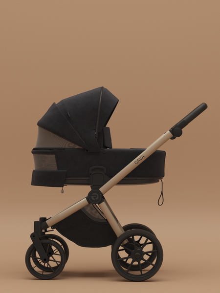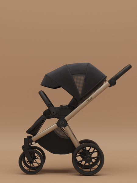 Model CAVA dostępny jest w 2 liniach kolorystycznych: COPPER z elementami wykończeniowymi w kolorze różowego złota i czarnym stelażem oraz CHAMPAGNE z czarnymi matowymi wykończeniami w połączeniu z anodyzowanym szampańskim kolorem stelaża. Zewnętrzne elementy tapicerki uszyte zostały z modnej tkaniny 3D (plaster miodu) z impregnacją zapewniającą spływanie wody oraz filtrem UV50+ chroniącym Twoje dziecko przed szkodliwym promieniowaniem i utrwalającym kolor tkaniny.