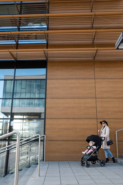 Wózek Wave fenomenalnie dopasowuje się do wzrostu prowadzącego, dzięki łatwej w regulacji rączce, otulonej elegancką ecoskórą.